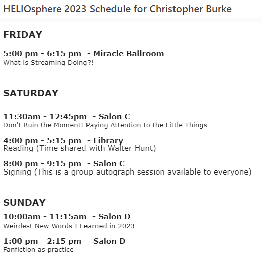 4/03/2022: I appeared last week at HeliosphereNY in Piscataway, NJ. Sorry about the lack of notice. I only feel comfortable updating this page from my home computer, and in the days before the convention, I was busy when I was home. I did my first and second live and in person readings ever. (I didn't one via Zoom at last year's convention.) They went well. I got several laughs at the smaller, more intimate setting that I share with two more seasoned authors (who bought in the people). And I closed out the eSpec Books Launch Party readings. The audience loved the portion of "Bringer of Doom" that I read, and at least one person immediately bought the book to read the ending. (And I personalized the book, which I'd signed in advance.) I also sold a copy of In A Flash 2020 -- to an editor! -- based on the two words, "Kindergarten Noir". I hoped she enjoyed it. I personalized her book as well with something that said that I knew something about her. All in all, a fun convention. And now I'm hoping that I can do more of them. Or at least more readings.