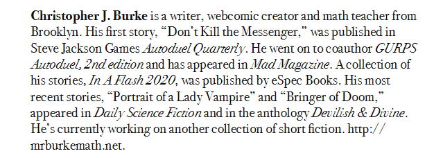 I'll also point out that there is a bonus story in the book, "Last Dawn", that appears in In A Flash 2020. The review didn't mention it. Likewise, another review of "A Heavenly Date / My Damned Best Friend" doesn't mentioned "My Own Personal Hell" from A Bucket Full of Moonlight. Both stories are complete. I may have to rethink my "bonus story" policy. I wonder if people skip them like previews for new books.